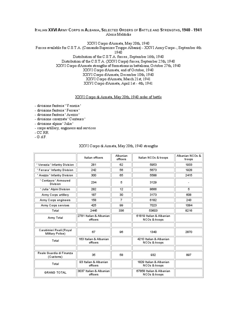 Xxvi Corpo Di Armata May 20th 1940 Order Of Battle Xxvi Corpo Di Armata May 20th 1940 Strengths Albanian Officers Pdf Free Download
