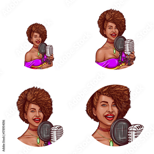 Set Of Vector Pop Art Round Avatar Icons For Users Of Social Networking Blogs Profile Icons Young Black Woman With Curly Hair Singing In Retro Microphone Musical Diva Buy This Stock
