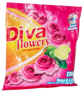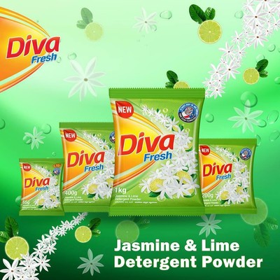 Diva washing powder. Odor eliminator deodorizer. Optical brighteners to make clothes look new and fresh. Diva multipurpose soap rol powder detergent and essex auto wash personal care. Long lasting fragrance with perfume magic technology.