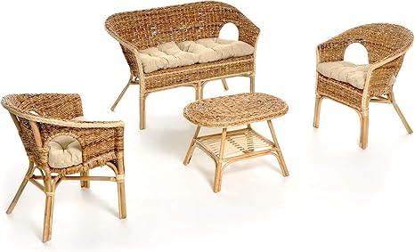 Set Lusso 2 Posti In Banano Naturale Completo Divano Poltrone Tavolino Cuscini Nonsolopoltrone