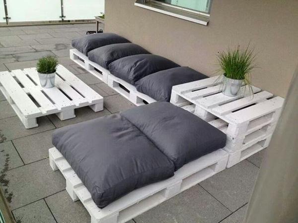 Semplici Ma Comodi E Alla Moda Due Divani Con Bancali Con Cuscini Trapuntati Bianchi Divano Con Bancali Arredamento Divano Pallet Fai Da Te