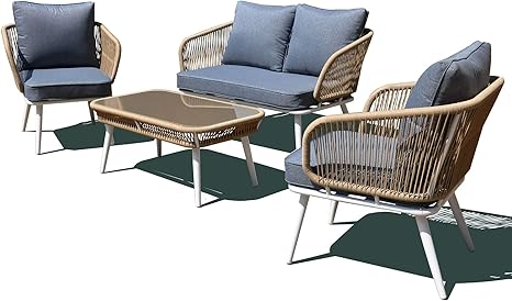I materiali hanno una finitura verde e sono trattati per uso interno e esterno coperto. Nelle sedute la struttura a cavalletto è in tubolare di alluminio. La struttura in alluminio garantisce solidità al prodotto. Divano 2 posti con struttura in acciaio zincato e schienale in corda intrecciata.